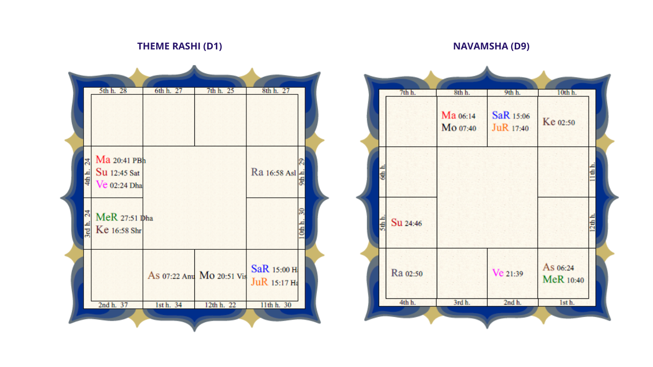 • D9 : Ketu en maison 10 (Gémeaux) indique un détachement progressif de la reconnaissance sociale, au profit d’une vocation alignée avec le sens et la transmission.